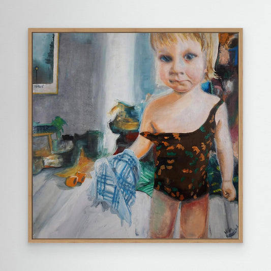 "Kom och bada!" Getting Ready – Figurative Oil Painting of Child Preparing for the Beach”