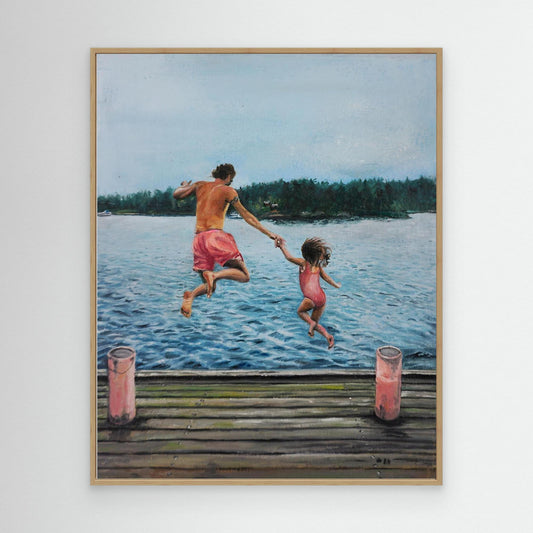 "Hopp" - Father and Daughter Jumping from Dock – Scandinavian Figurative Oil Painting