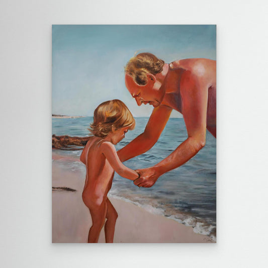 "Ge mig handen" - Grandfather and Child on the Beach – Scandinavian Figurative Oil Painting