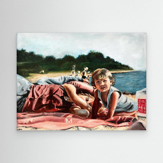 "En dag på stranden" - Aunt and Child at the Beach - Scandinavian Figurative Oil Painting